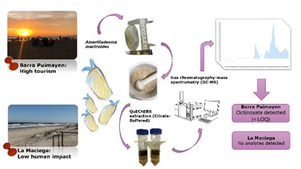 In this work, we study two UV filters (octocrylene and octinoxate) and the synthetic fragrance galaxolide in the yellow clam (Amarilladesma mactroides). Two beaches were strategically selected based on their contrasting population density, level of tourism and recreational activity. The clam samples used in this study originate from two distinct subpopulations. Samples from each beach were separated into 4 sizes (<54 mm, 55–56 mm, 57–58 mm and >59 mm); then, a modified citrate buffered QuEChERS method was used for subsequent evaluation in gas chromatography-mass spectrometry (GC-MS). The recoveries for all analytes were in the range between 70 to 102%, the RSD oscillated between 1 to 18%, and the limit of quantification was defined as the lowest recovery level with a value of 50 µg Kg-1 for all three analytes. As a result, the presence of the UV filter octinoxate was detected in the size of 55–56 mm on Barra Puimayen beach, being lower than the limit of quantification (50 µg Kg-1). However, the evaluation indicated the absence of analytes from the individuals belonging to La Maciega beach, which presents a minimal anthropogenic impact.